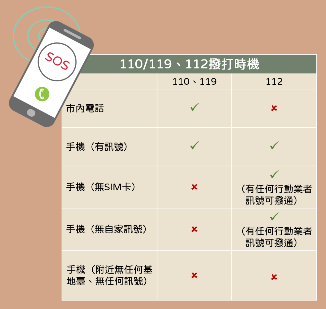 在多數國家撥打112,只要手機尚有電力並在任何一家當地電信商訊號涵蓋範圍內,無論手機有沒有安裝SIM卡,均可撥至當地急難救助單位或提供相關指引。